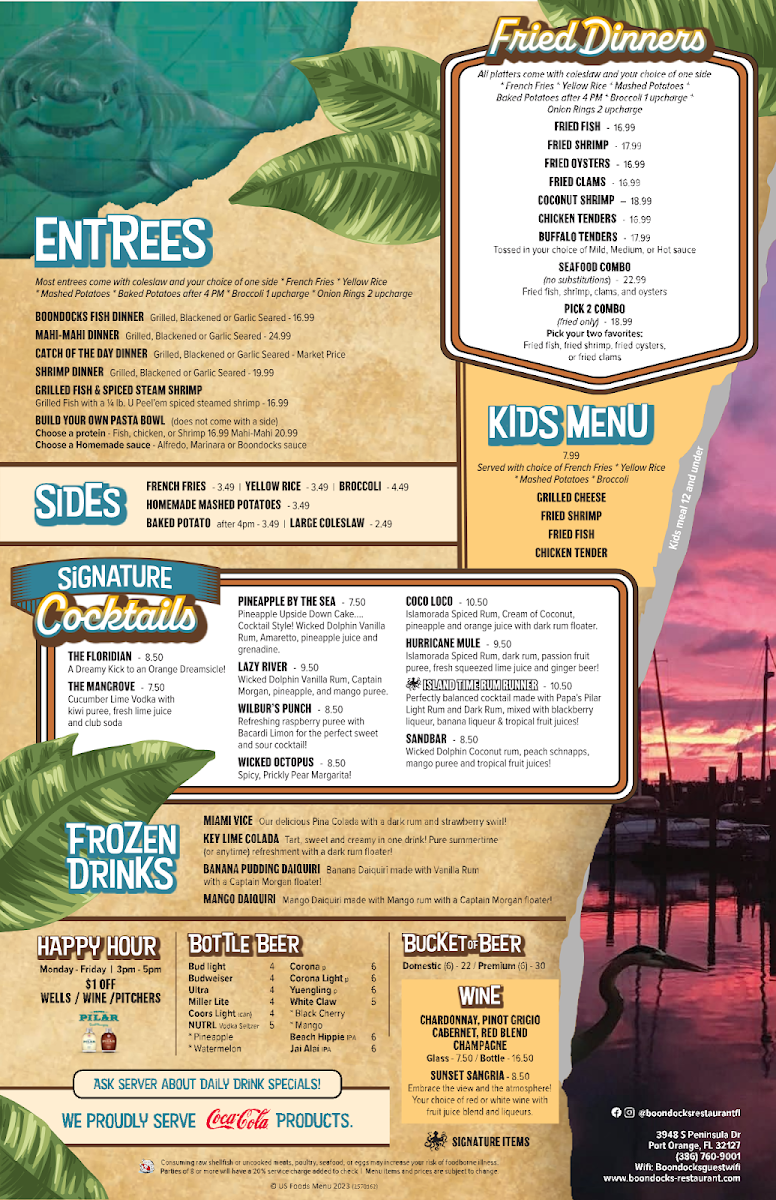 Located on the scenic shores of Port Orange, Boondocks Restaurant is a seafood lover's paradise. This vibrant eatery leverages its stunning location to create a bustling yet serene dining experience. The menu is a delightful showcase of fresh seafood that has garnered rave reviews from locals and visitors alike.